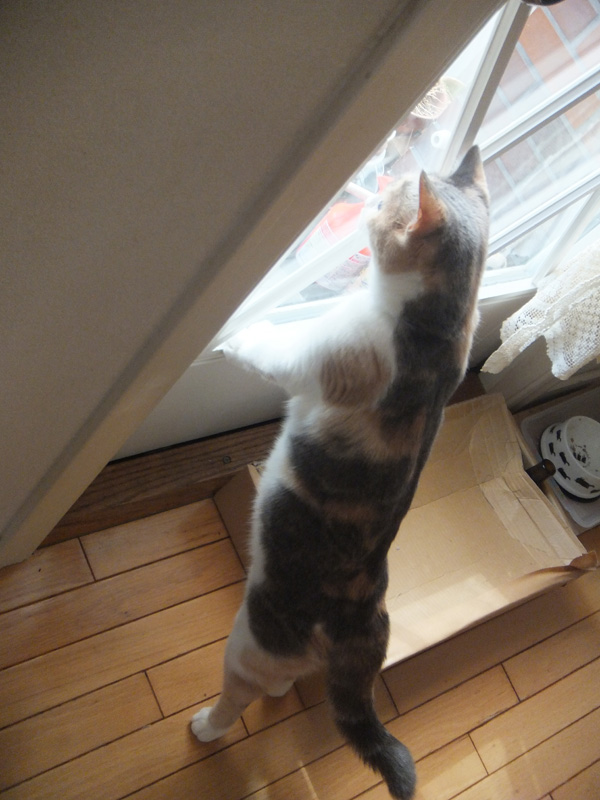 キクは、窓ぎわで、長くなったり丸まったり、しっぽ、ぶんぶんふりふり…
