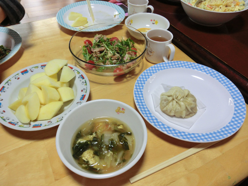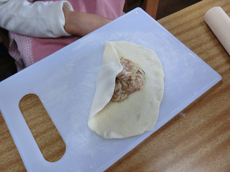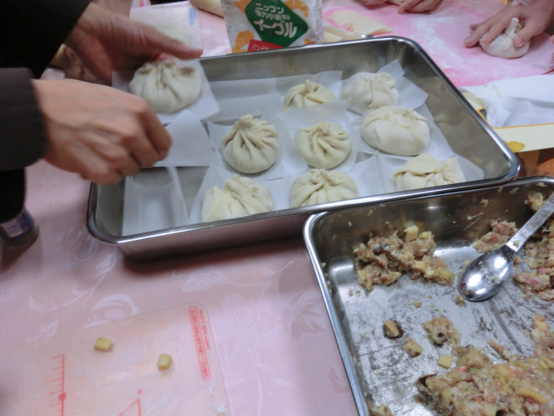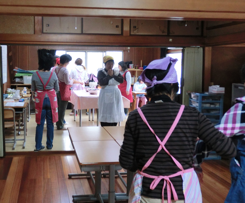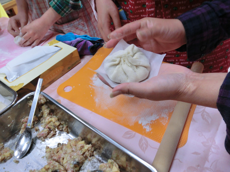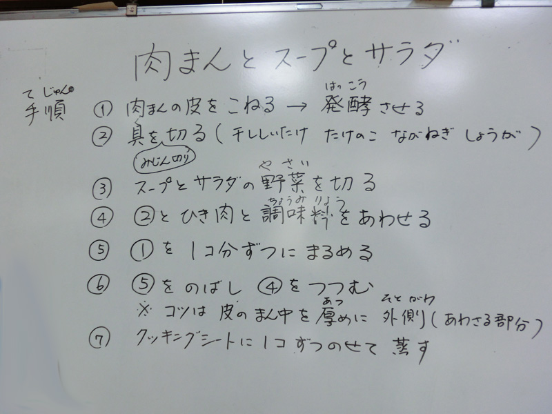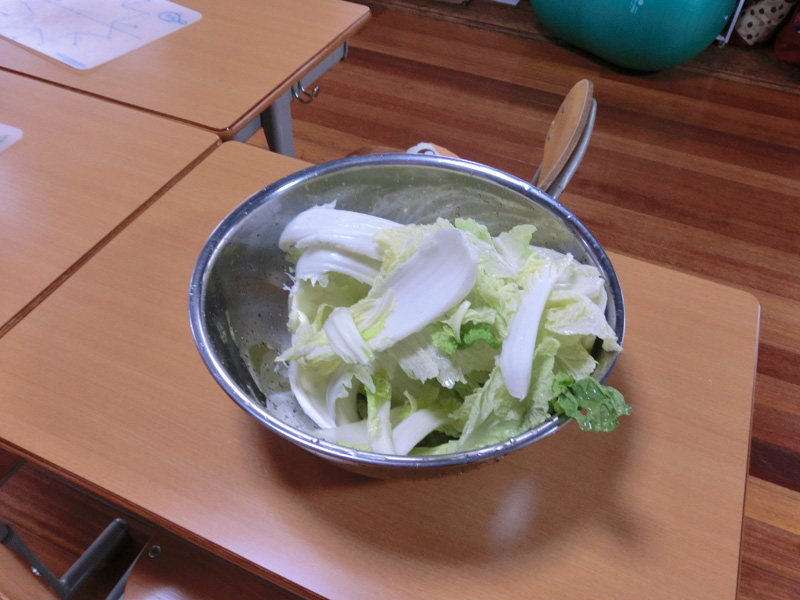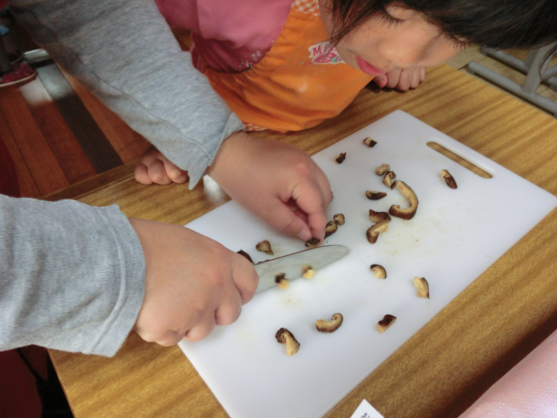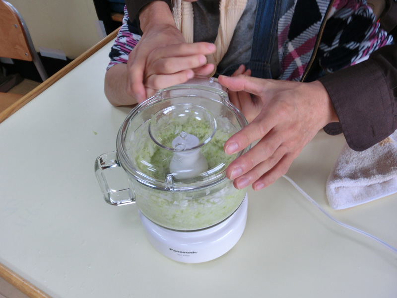 包丁を使うことが難しいメンバーは キノコや白菜を手でちぎったり、フードプロセッサーを「押す」ことで 作業に参加します。
