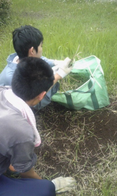 刈り取られた草を 詰めています。