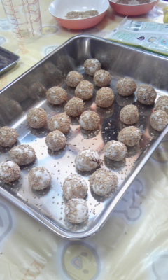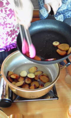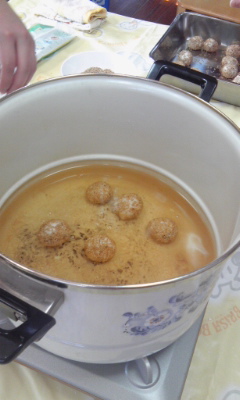 今回は、初挑戦のゴマ団子作りもありました。前もって自宅で作ってみた時は、とてもうまくできたのですが、白玉であんこをきれいに包むのと、低温で焦がさないように揚げるのは、ちょっとむずかしかったようです。次回の課題、またちょうせんしてみたいと思います。」