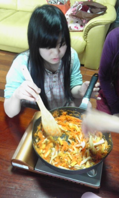 基本は、めんつゆ!!。 サラダ油で炒めて、みりん、めんつゆ、
